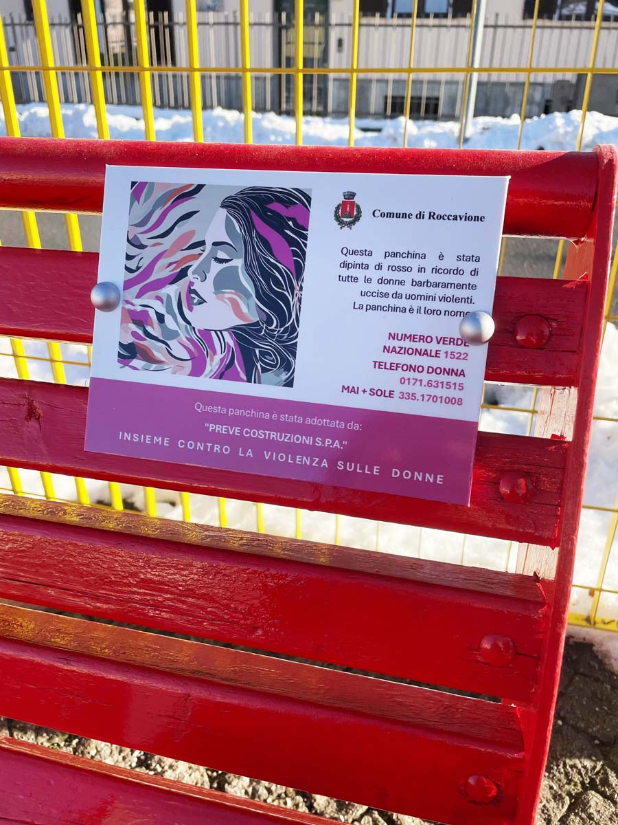 Il colore rosso, scelto come simbolo universale di contrasto alla violenza di genere, trova nelle panchine un luogo emblematico attorno al quale fermarsi e riflettere. La panchina rossa che abbiamo installato rappresenta oggi un segno concreto e visibile per dire no alla violenza, con la speranza che possa incentivare il maggior numero di persone a interrogarsi sul contributo che ognuno di noi può apportare nel proprio quotidiano e che vede come punto di partenza – e di arrivo – il rispetto di ogni individuo.