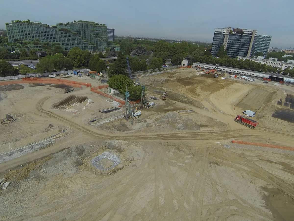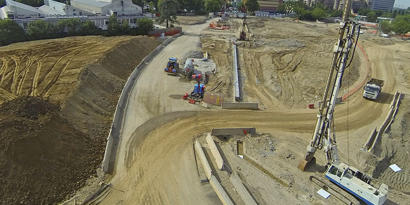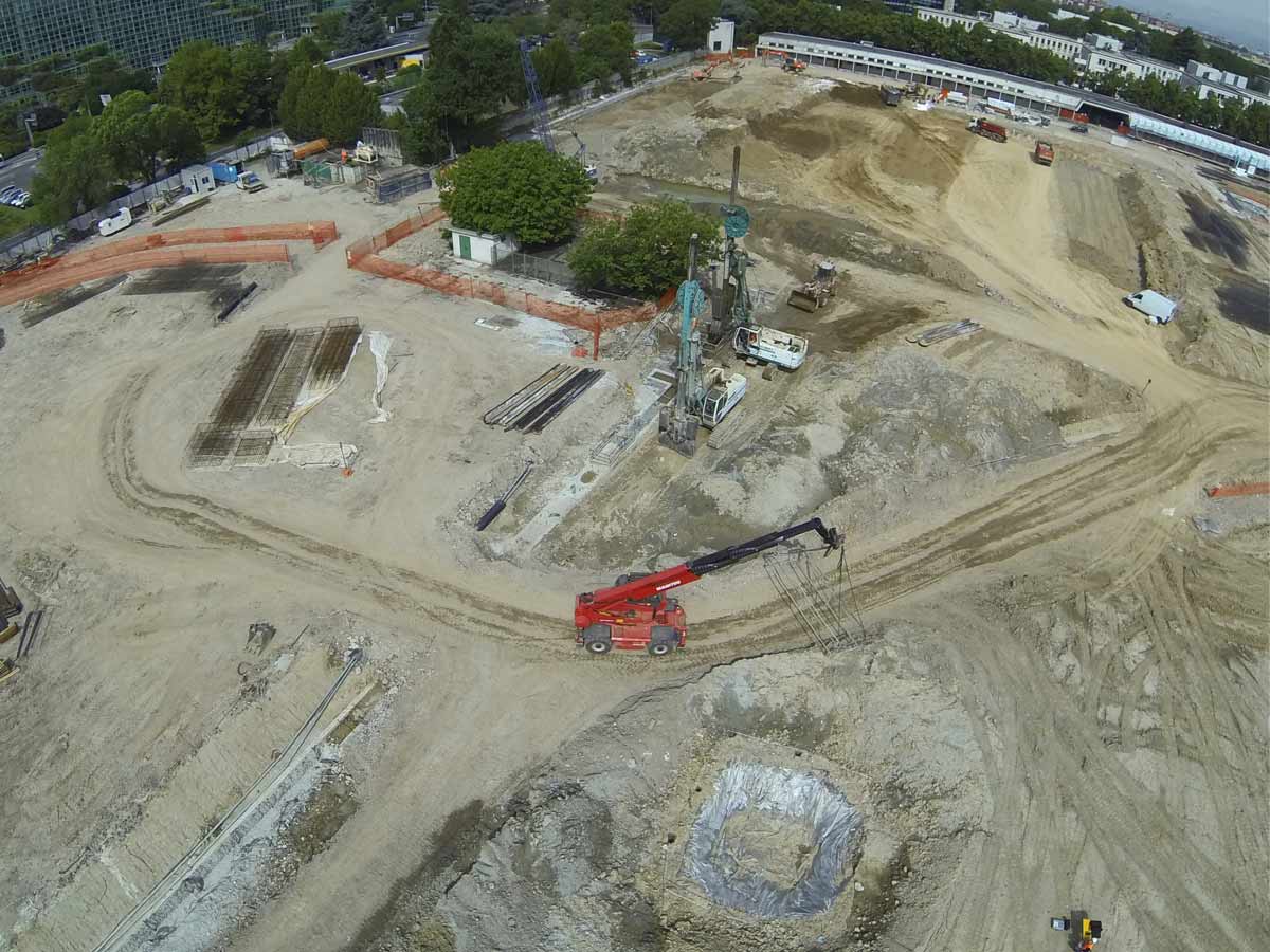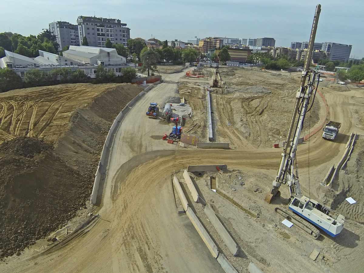 NUOVO CENTRO DIREZIONALE. Esecuzione di scavi e movimenti terra per la realizzazione degli spazi circostanti la nuova sede. Realizzazione di diaframmi in c.a. con sistema impermeabilizzazione “vasca bianca”.